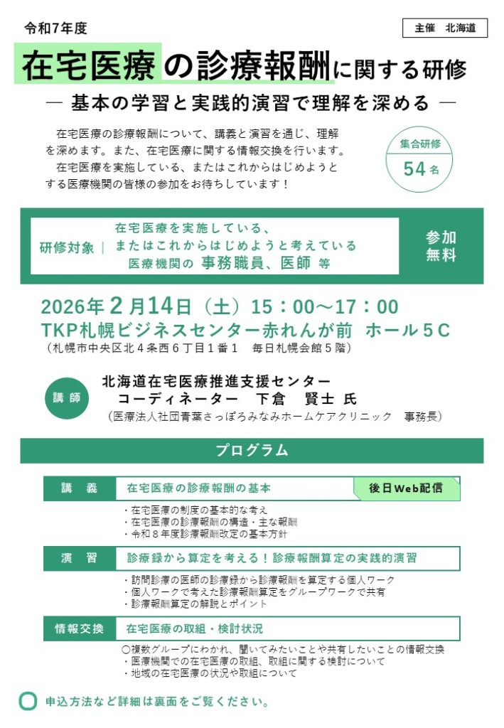 - 本研修で得られた個人情報については、適切に管理を行い、北海道在宅医療推進支援センター事業以外の目的に使用することはありません。