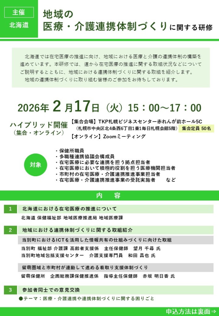 - 本研修は、北海道委託業務「令和7年度(2025年度)北海道在宅医療推進支援センター事業」の「全道の多職種連携協議会及び『在宅医療に必要な連携を担う拠点』の構成員等を対象とした研修」として開催いたします。